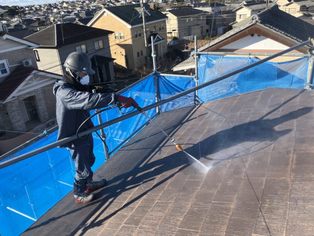 コロニアル屋根洗浄工事施工中