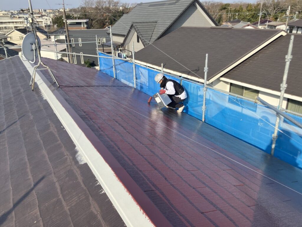 エスケー化研超耐久弱溶剤形特殊フッ素樹脂塗料で中塗り施工中です。