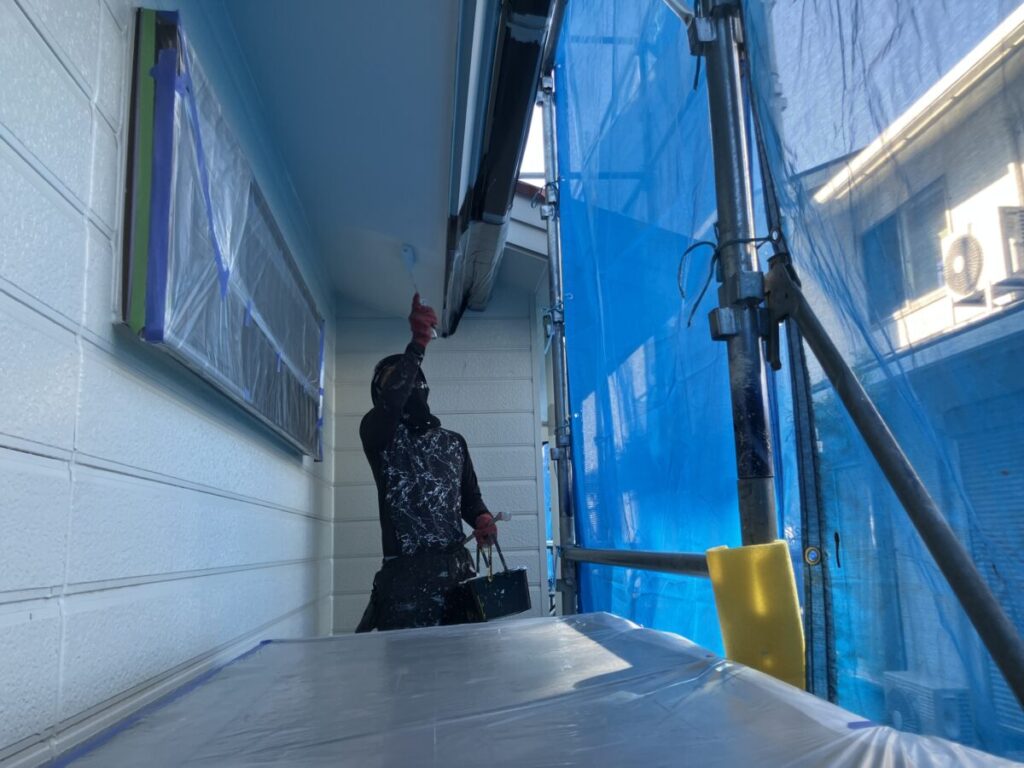 軒天塗装施工中