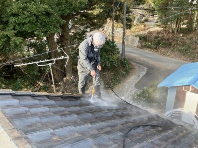屋根から洗浄工事施工中です。