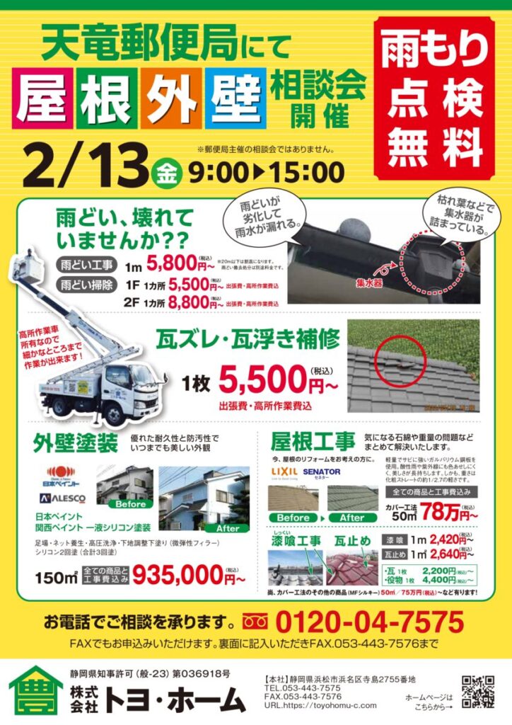 2月13日㈮、天竜郵便局さん一部スペースをお借りして屋根・外壁相談会を開催します。