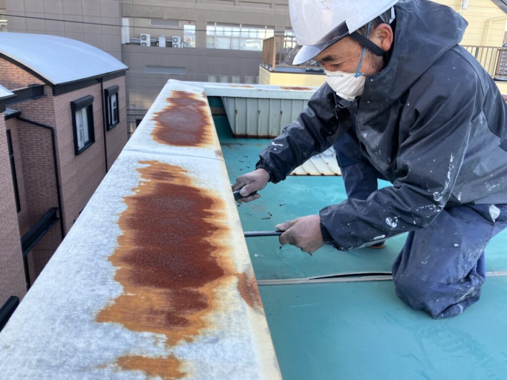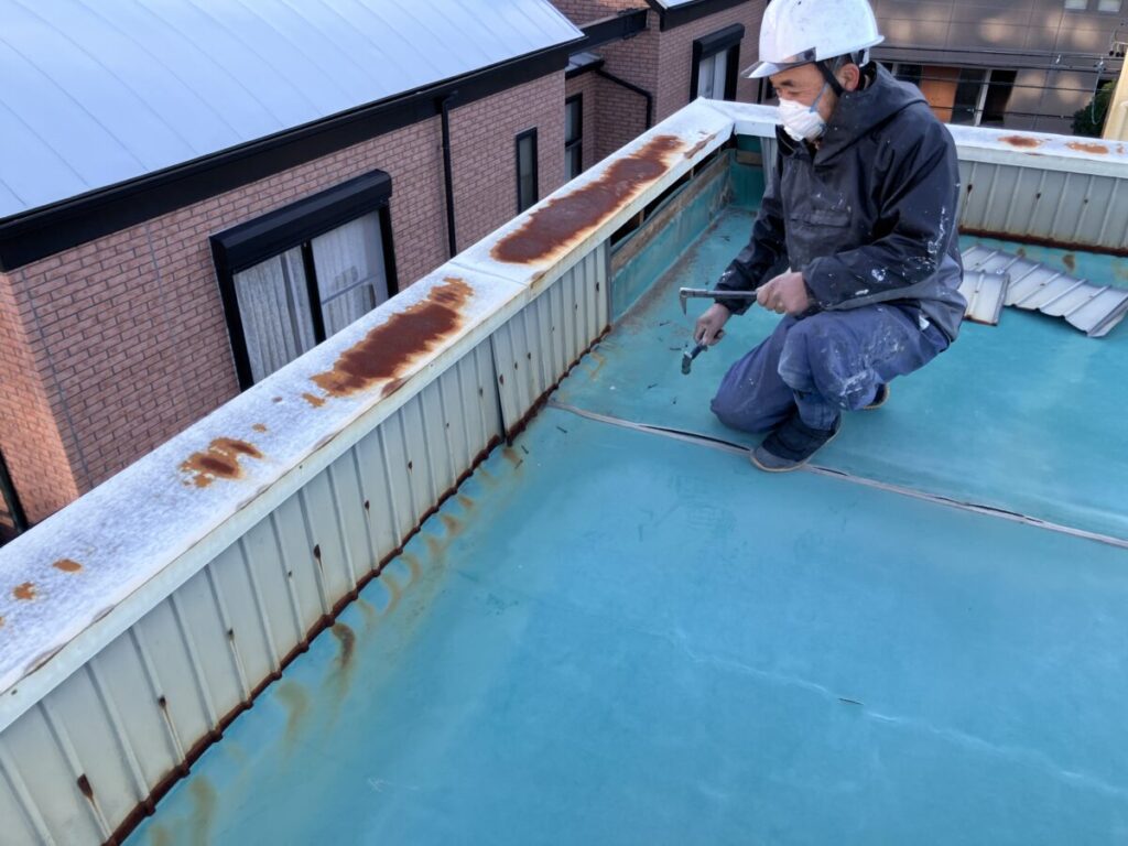 雨漏り修理工事で屋上防水工事前の既存板金撤去施工中です。