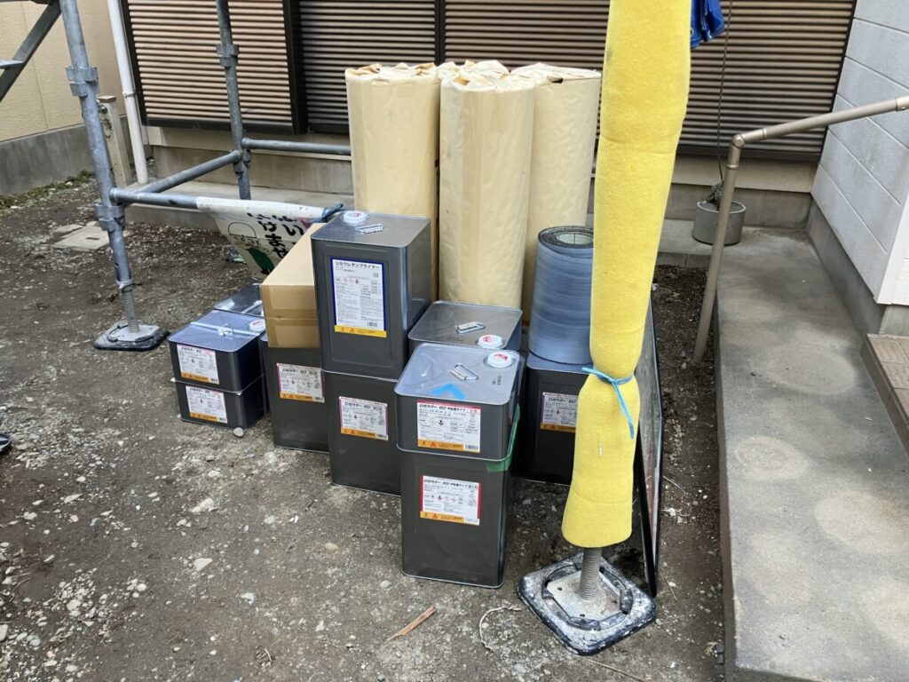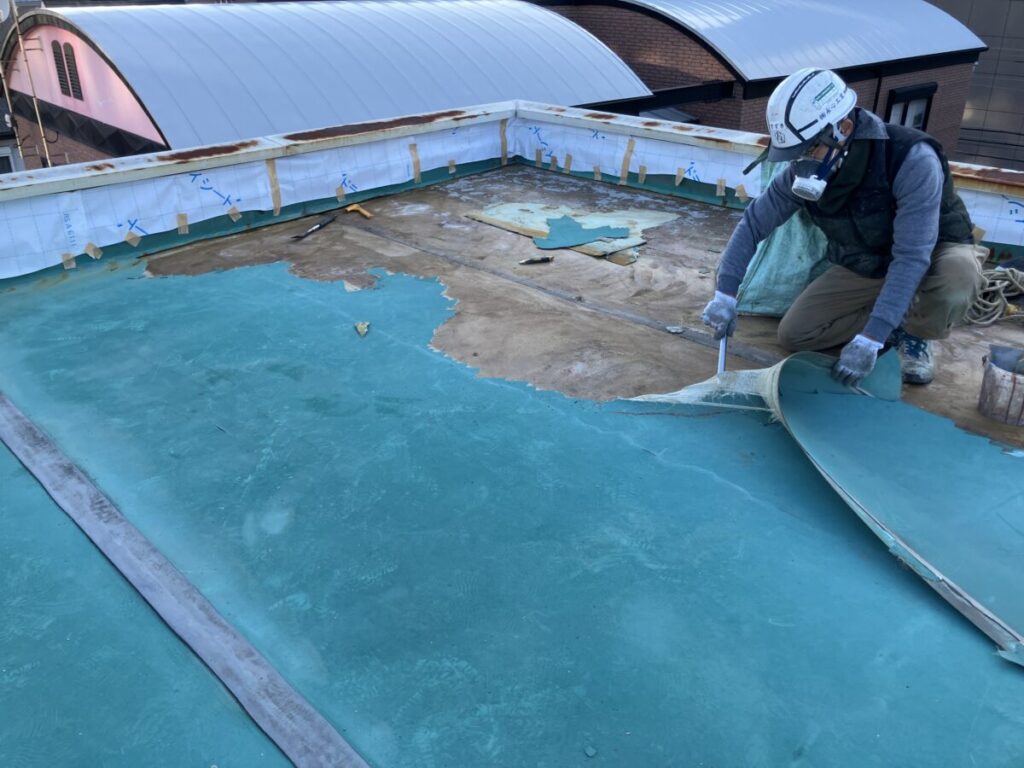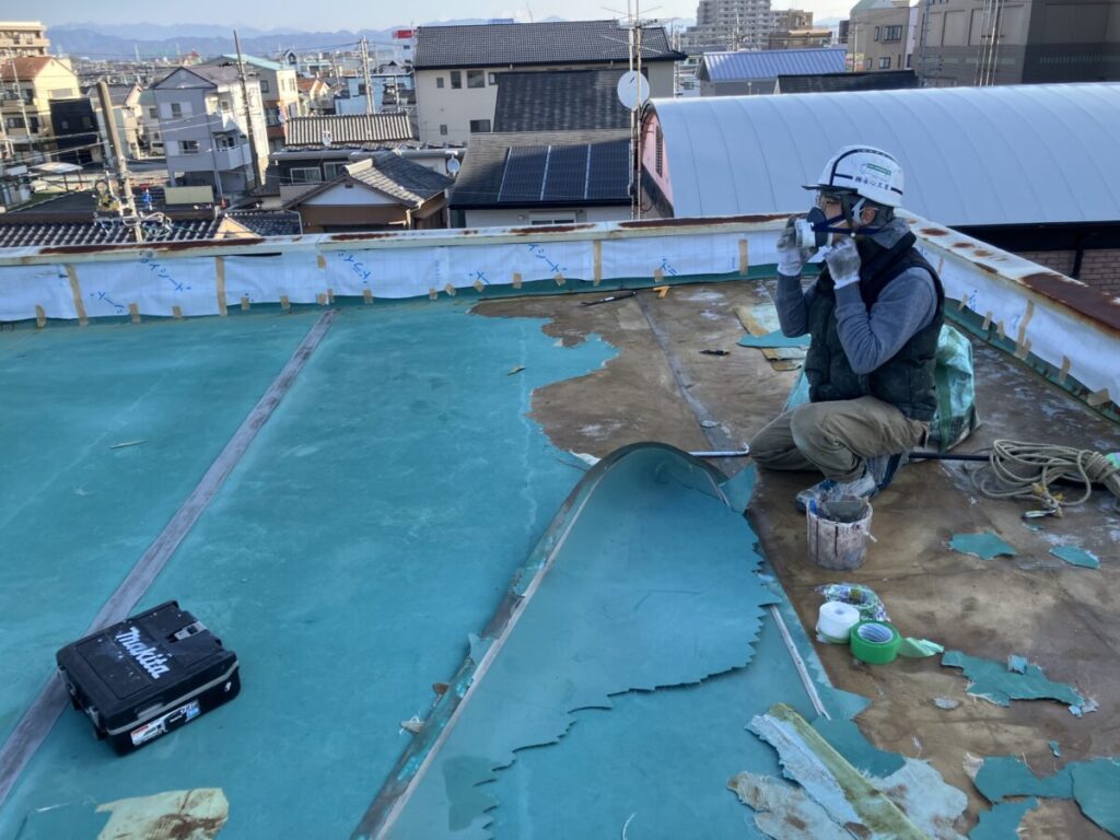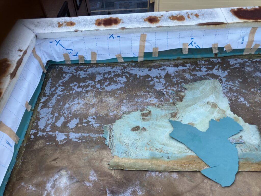屋上のパラペット板金撤去後、シート撤去施工中です。