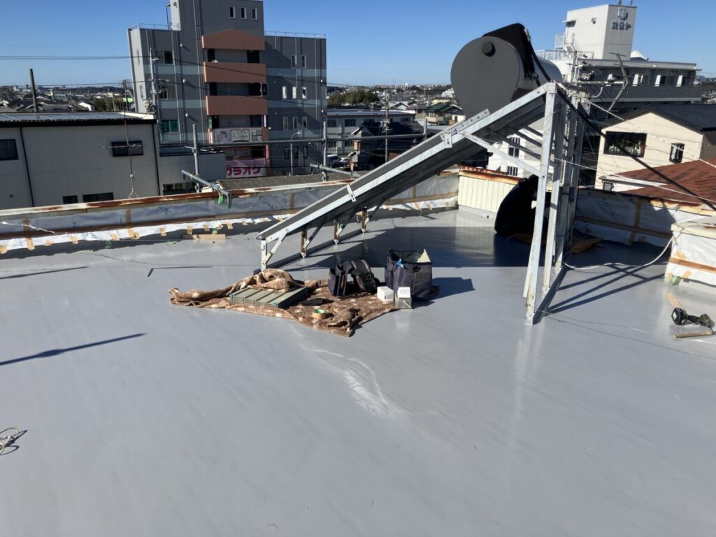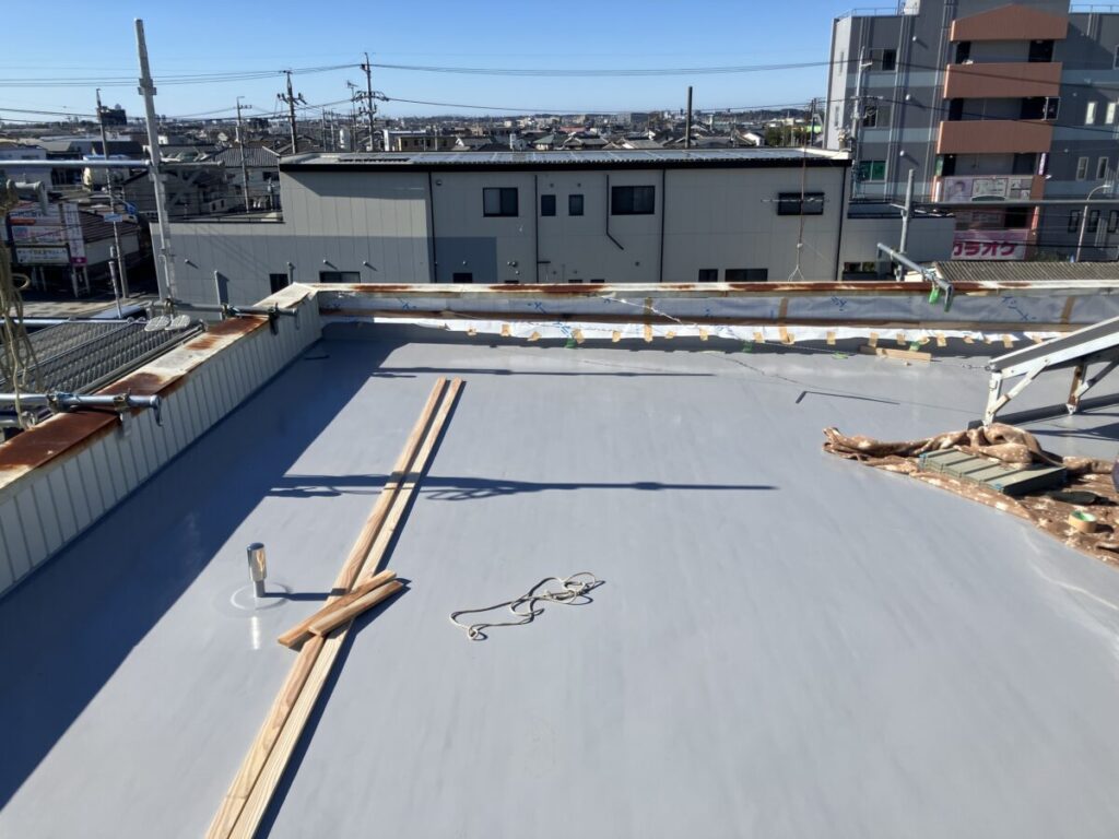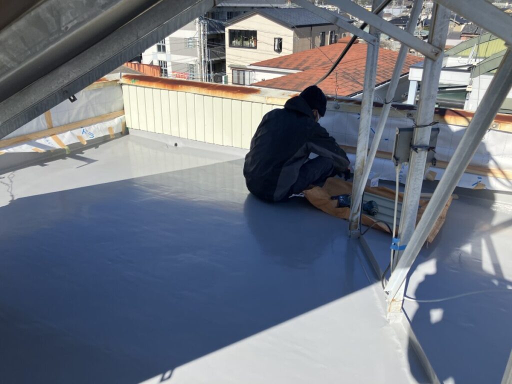 昨日屋上防水工事が完了してパラッペット部分の角波トタン貼り工事施工中です。