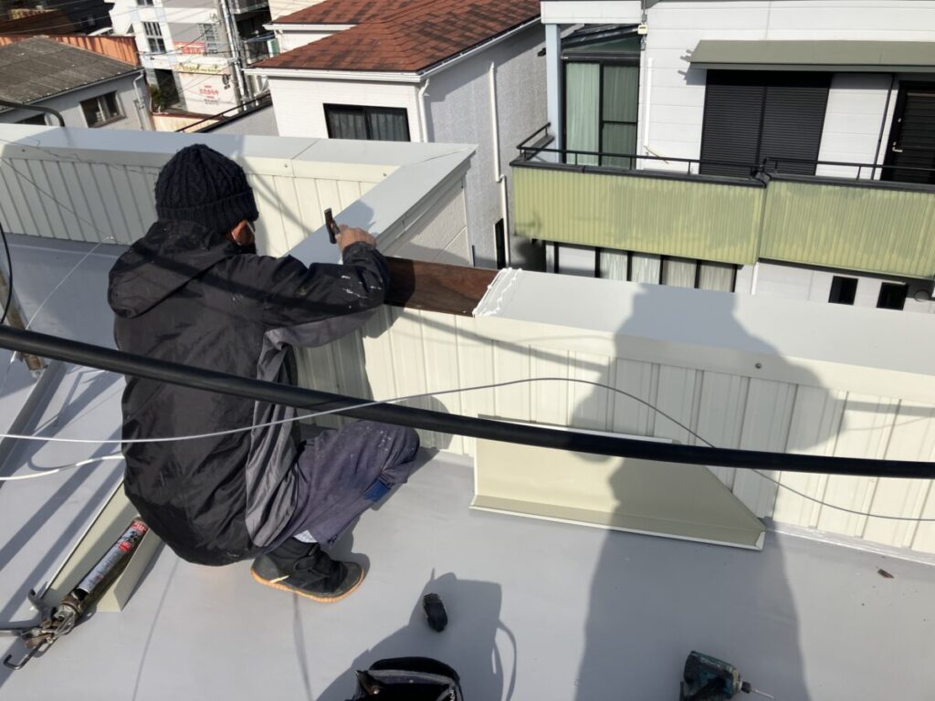 笠木部分板金工事施工中です。