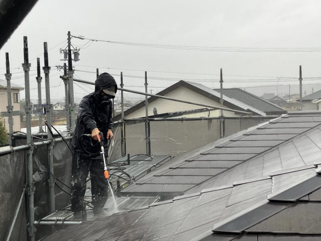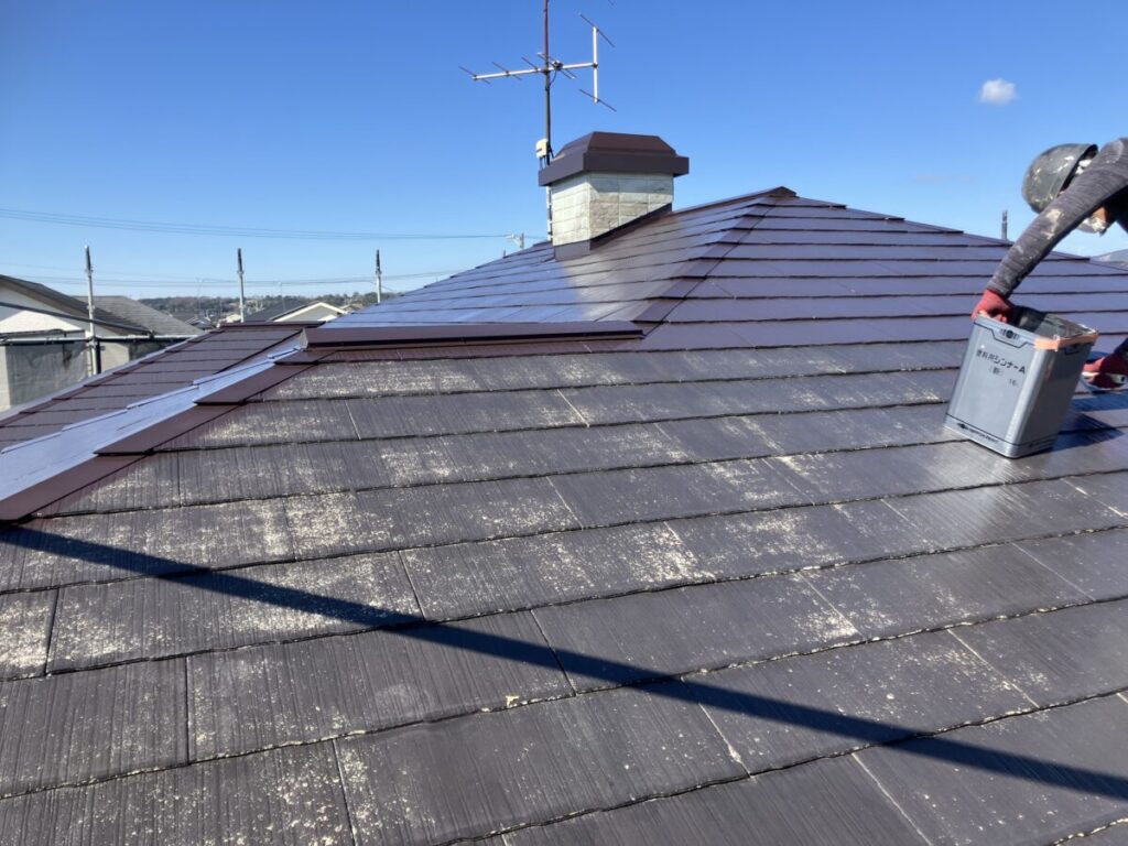 コロニアル屋根に対して高圧洗浄後、シーラー塗布後、上塗りとしてハルスハイリッチシリコンを