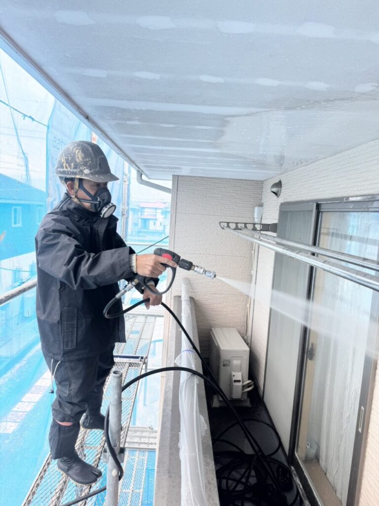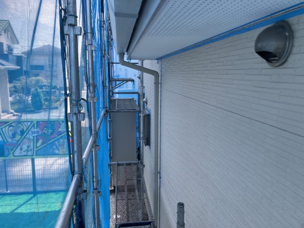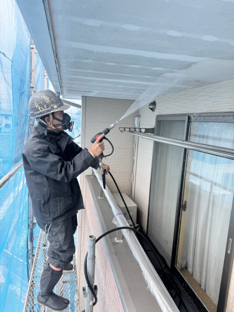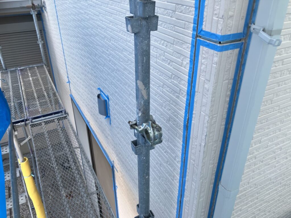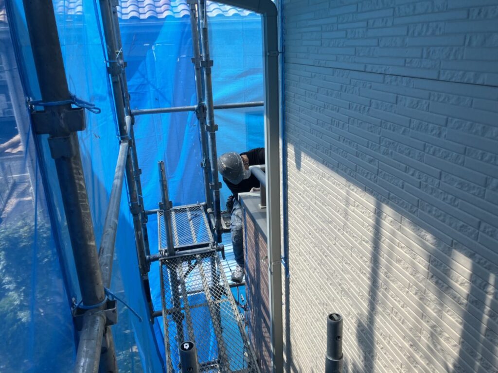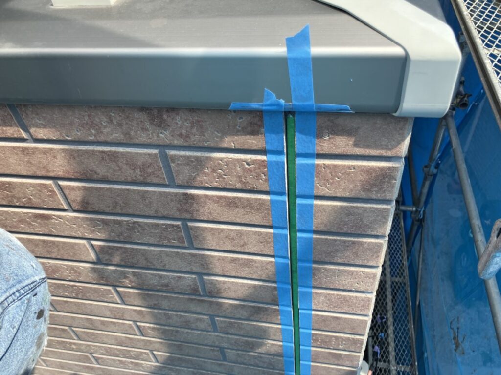 その後、仕上がりをきれいにするために養生テープを貼り、施工範囲を明確にします。これにより、外壁を汚さず、美しいラインで仕上げることができます。