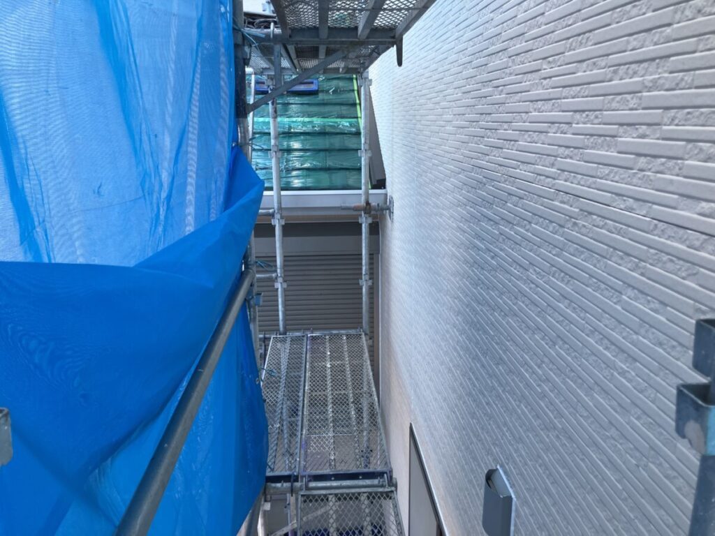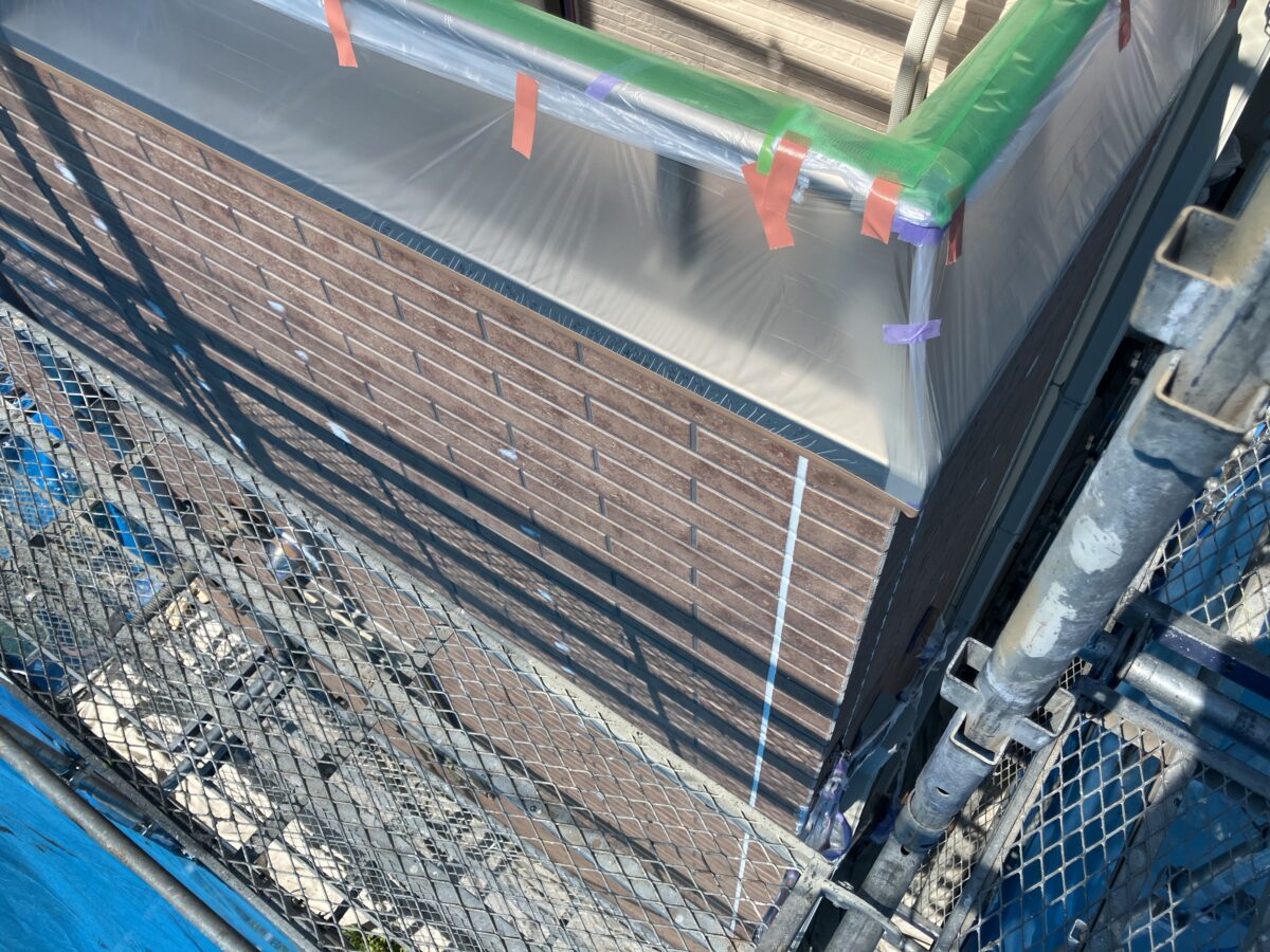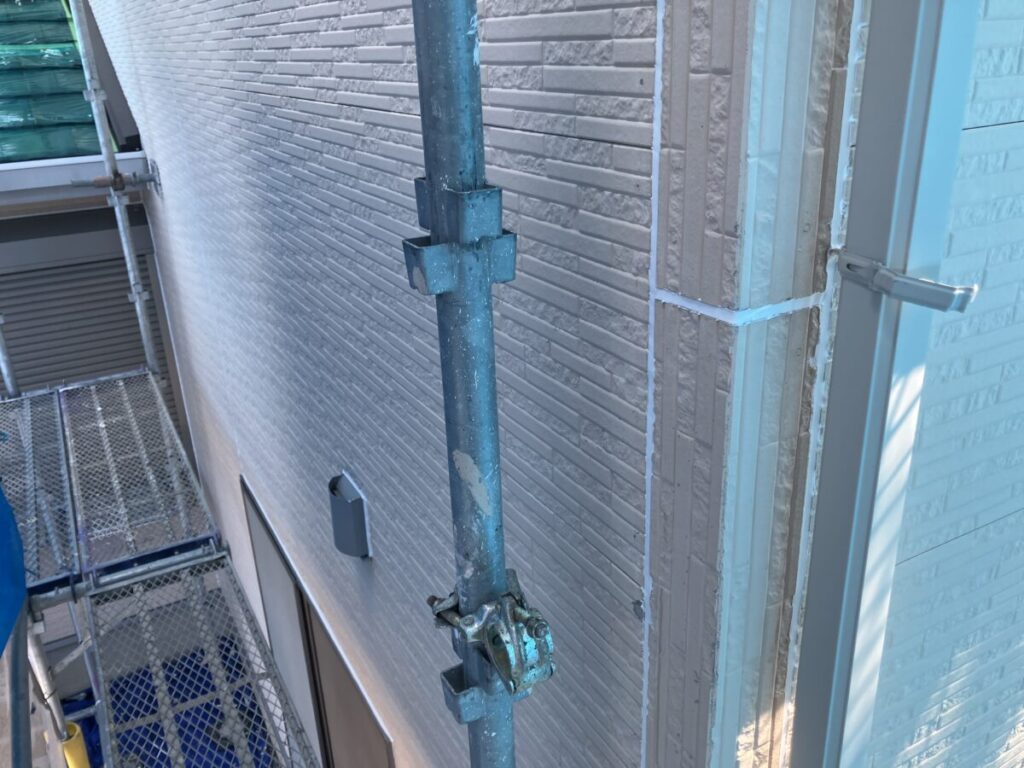 現在は、塗装前の重要な下準備であるシーリング工事を施工中です。数日前にはボンドブレーカーのテープ貼りを丁寧に行い、その後シーリング材の充填作業へと移りました。打設したシーリング材は、しっかりと隙間に行き渡るように充填し、ヘラで表面を均して美しく仕上げています。