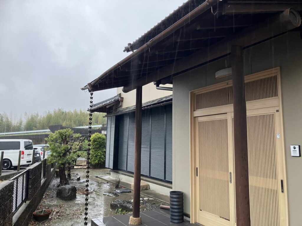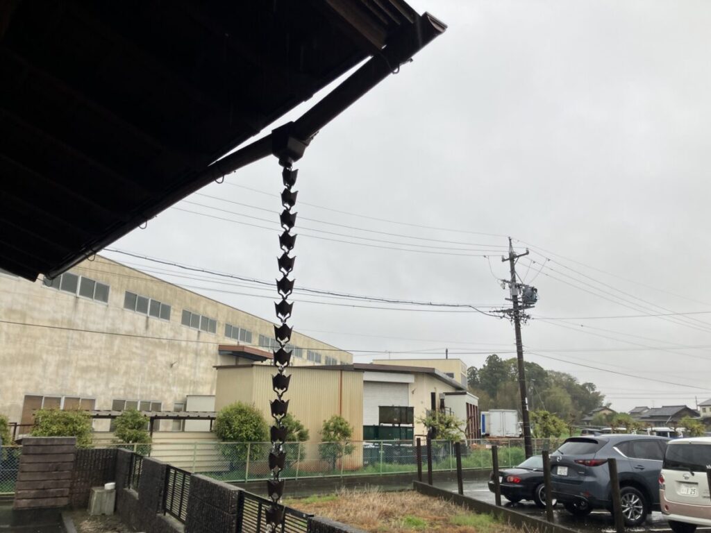 今回のご相談は、玄関ポーチに設置されている“くさり樋(チューリップ型)”の不具合についてでした。昨年から続く雨の多さの影響もあり、様子を見ながらご使用されていたそうですが、ついに鎖部分が下がってしまい、雨水をうまく受けられない状態に。