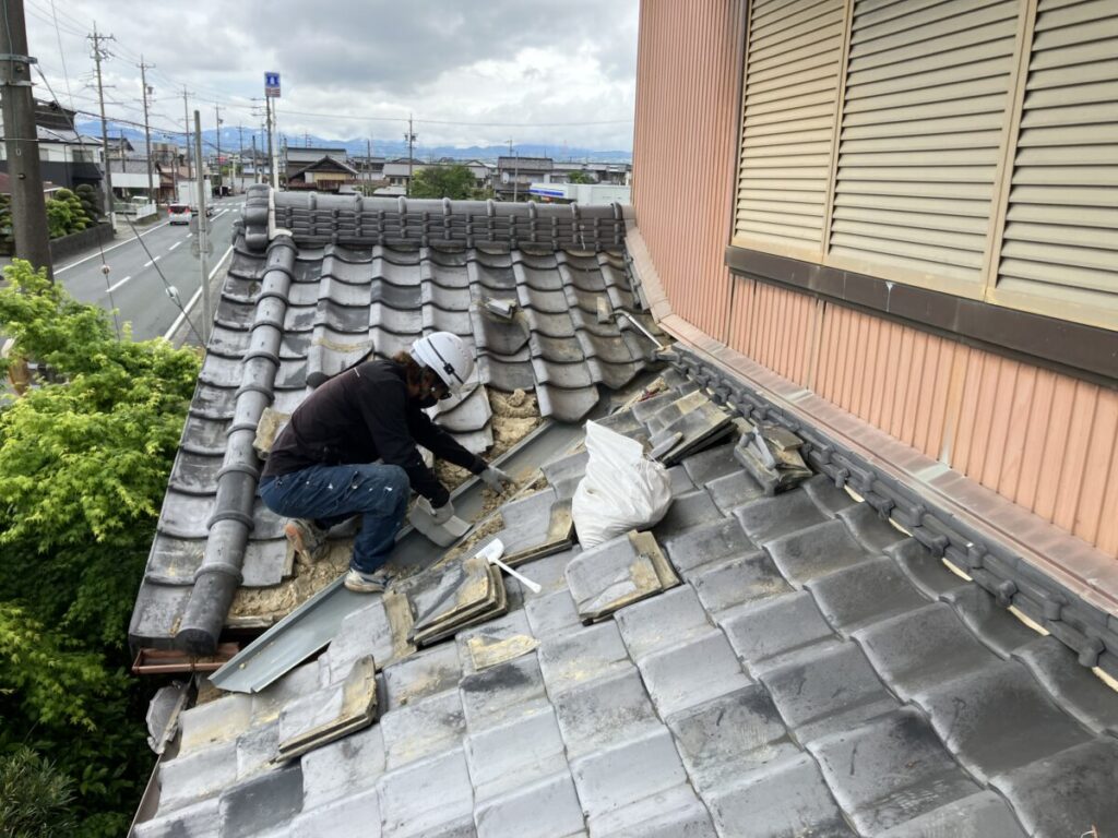 そこで現在は、既存の谷どいを撤去し、新しくステンレス製の谷どいへ取り替える工事を進めています。作業内容としては、まず谷まわりの瓦を丁寧にめくり、古い谷どいを取り外します。その後、新しいステンレス製の谷どい板金を設置し、最後に瓦を元に戻すという流れです。いわゆる瓦の脱着を伴う工事になります。