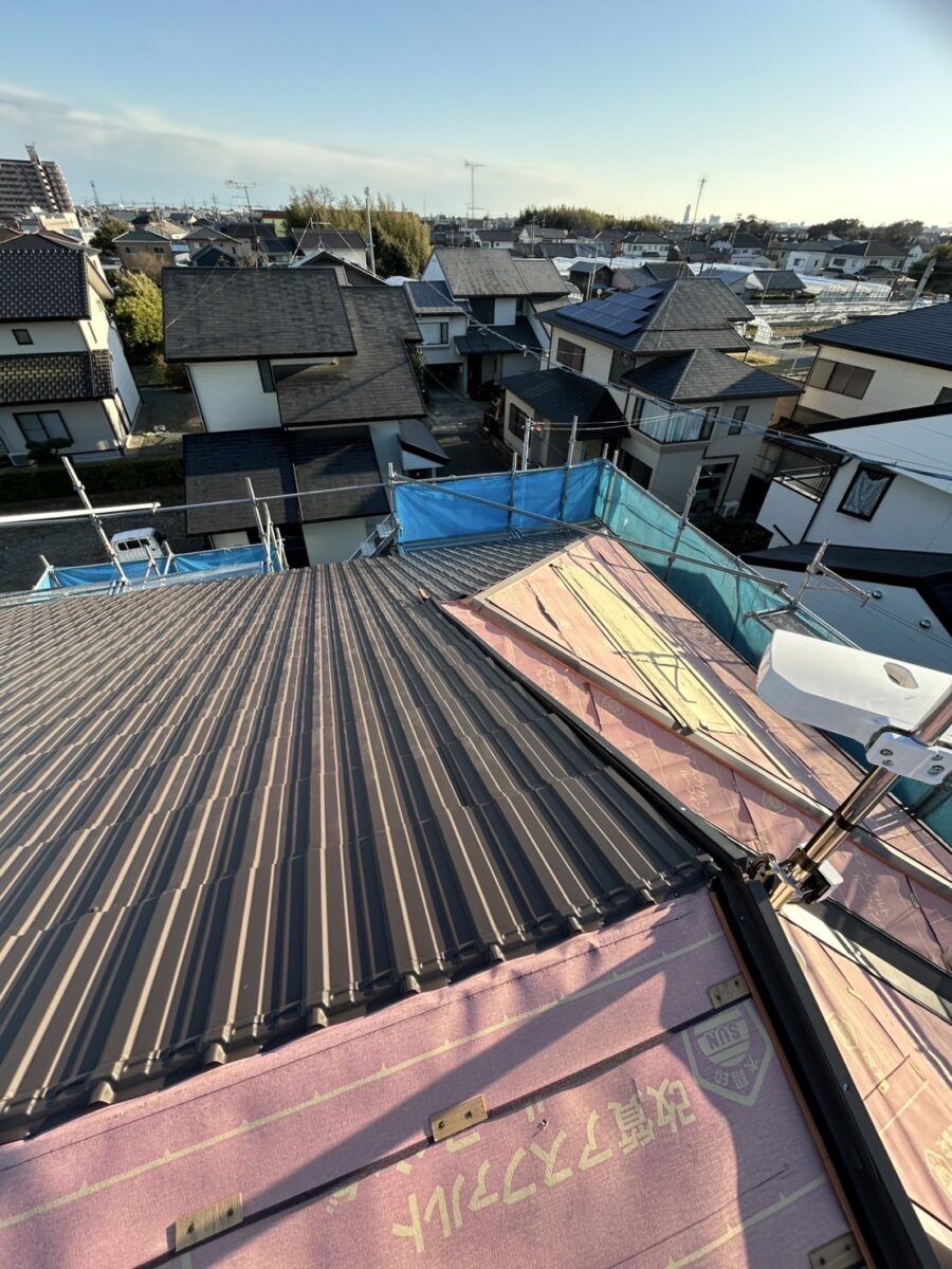屋根カバー工事施工中です。棟板金前のタフモック取り付け後これから雨押え板金等施工していきます。