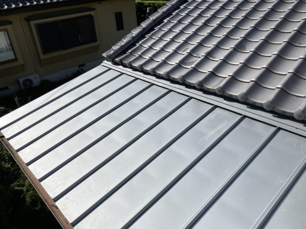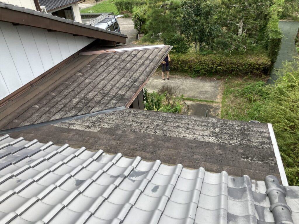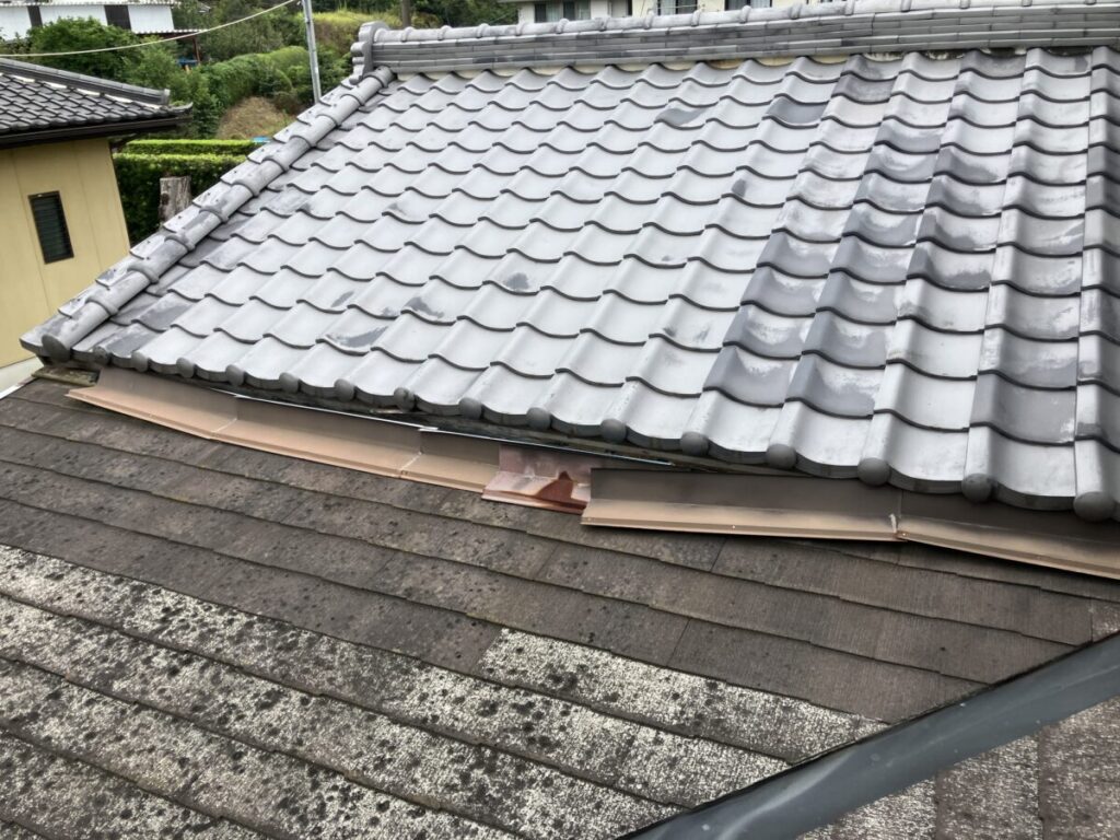 屋根に上ってみると屋根瓦とコロニアル屋根の境目雨押さえ板金が外れていてこの部分から雨水が侵入していると考えれますが
