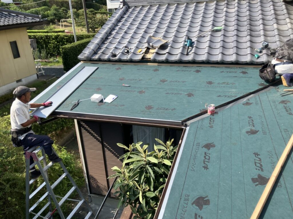 コンパネ・ルーフィング貼り施工後、水切り板金施工中