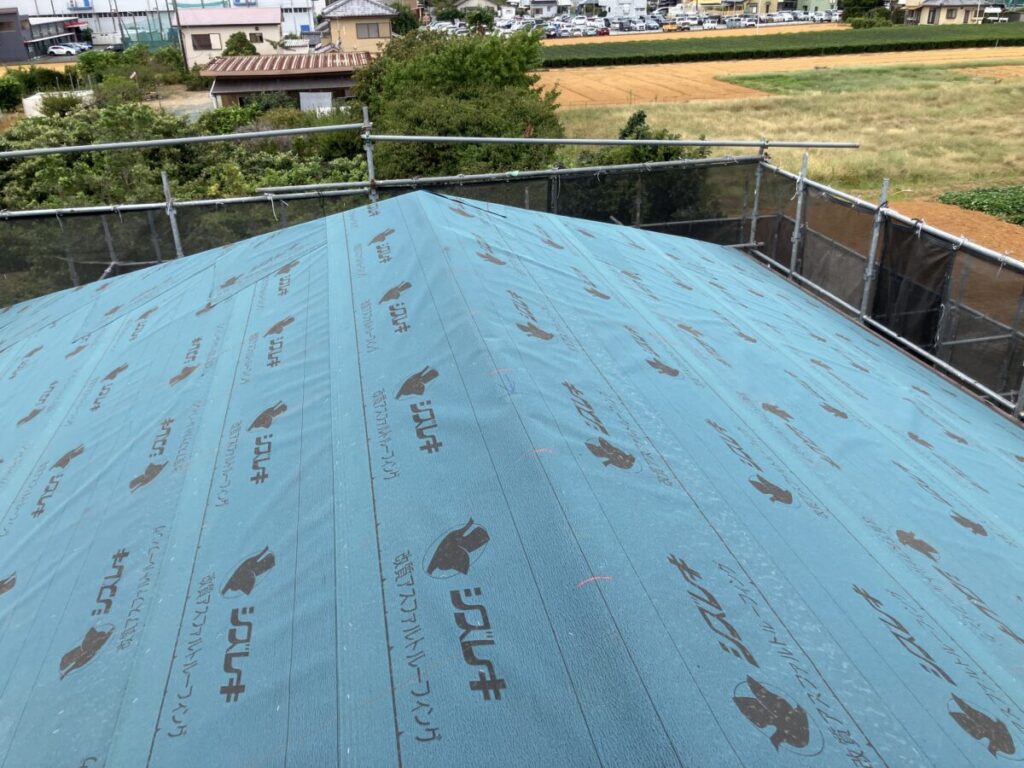 二階の屋根は、ルーフィングシート張りまで完了しています。