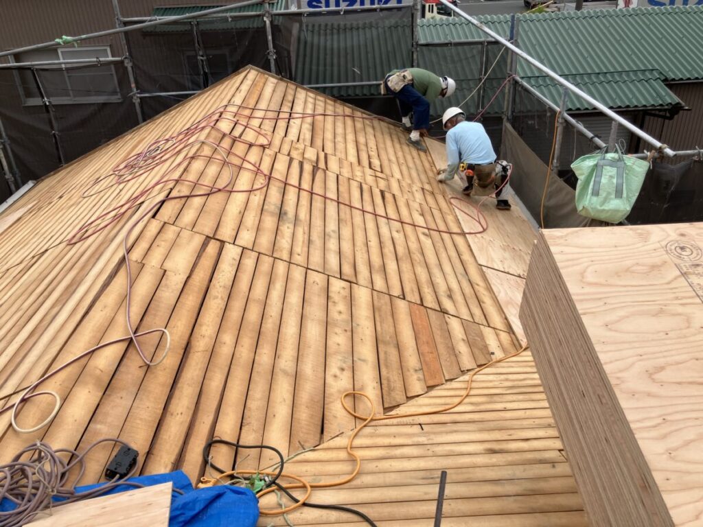 屋根葺き替え工事で平屋部分の屋根撤去後