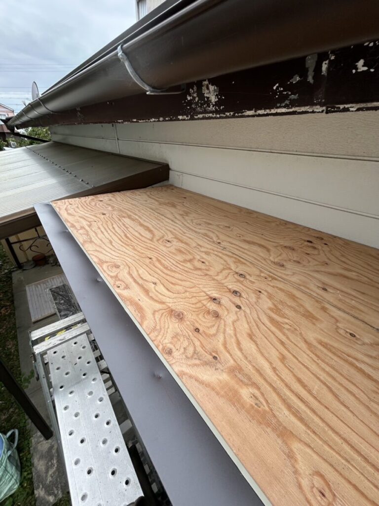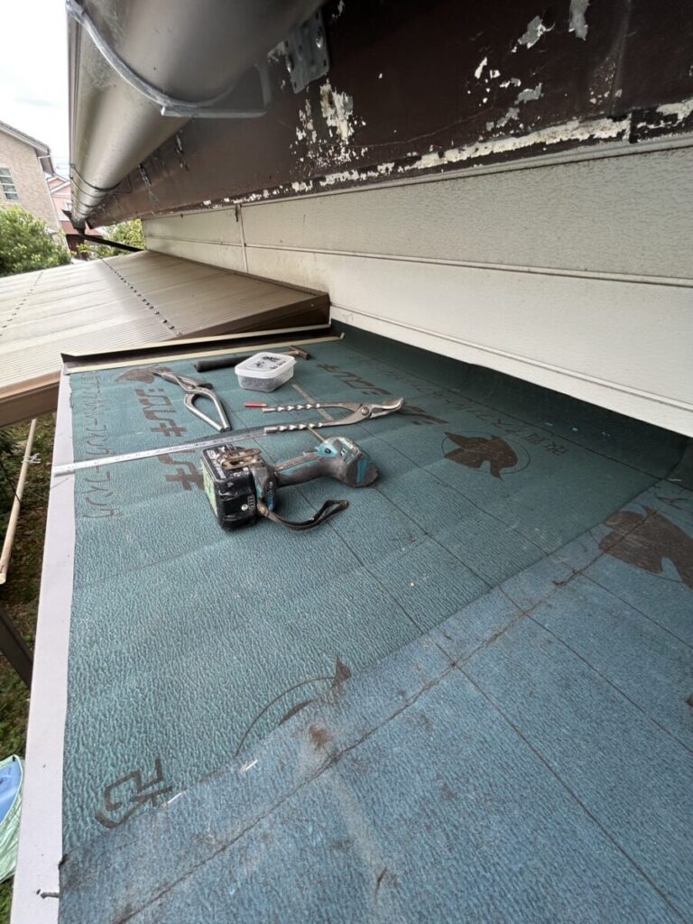 ルーフィングシート貼り後、水切り板金施工中