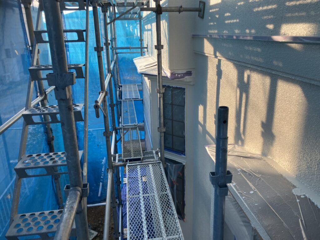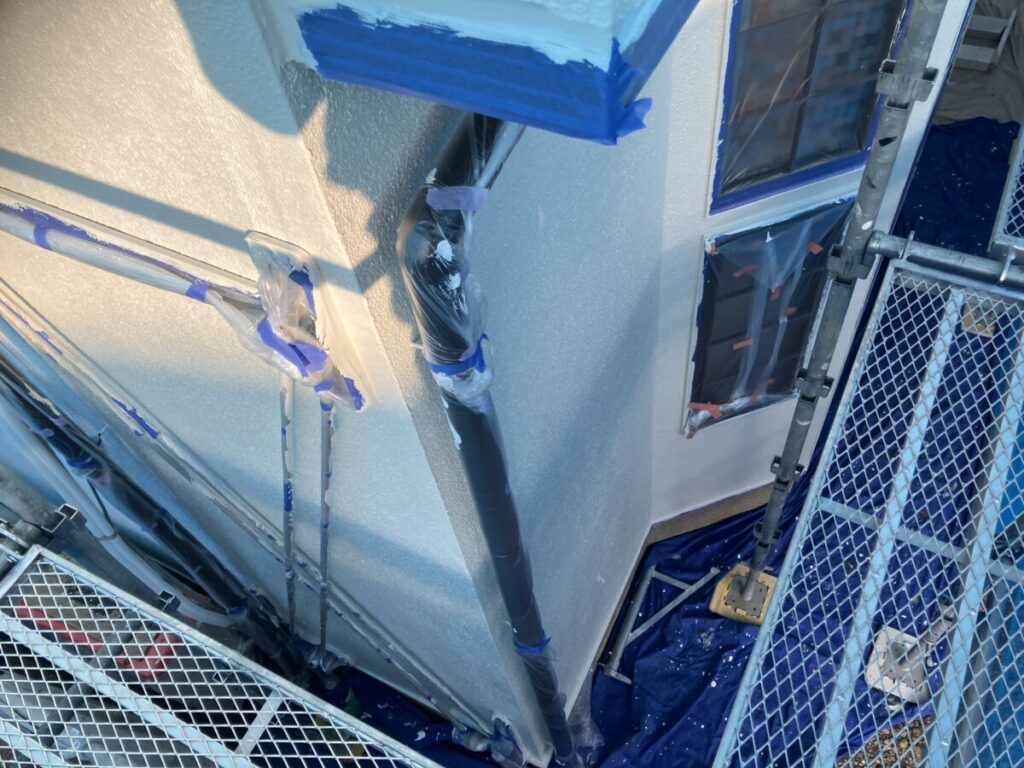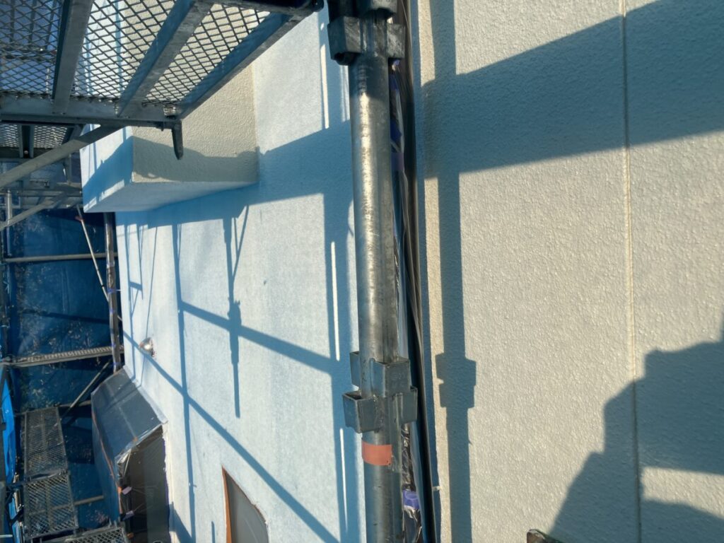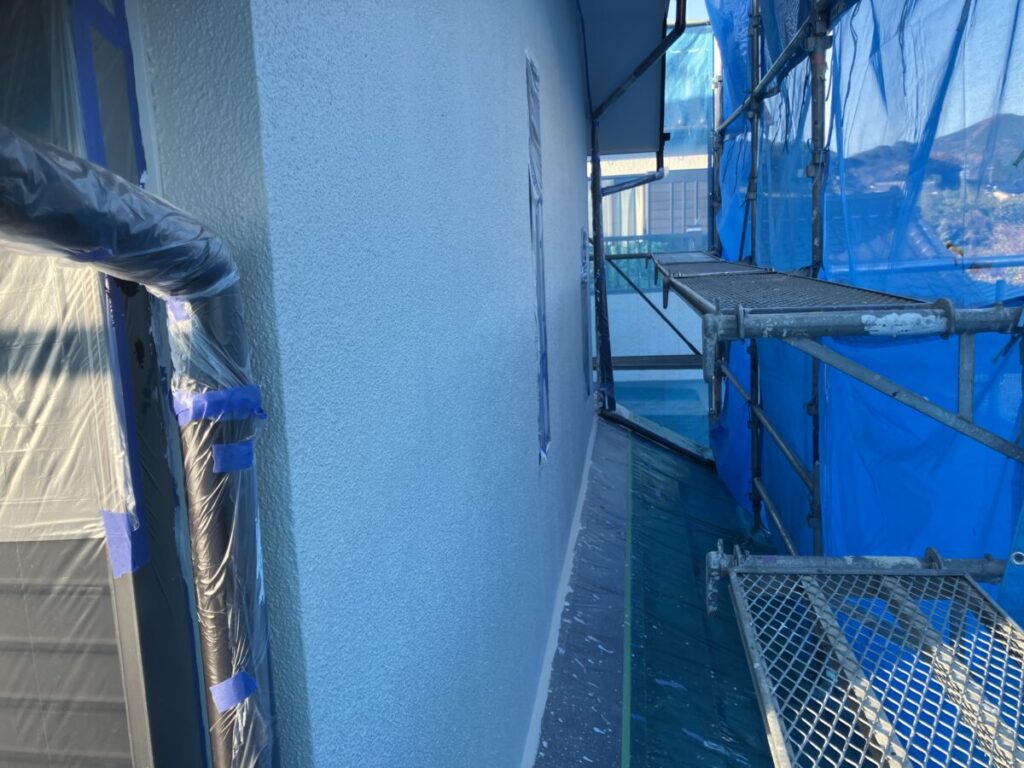 2F東面壁は、マスチック施工後、日本ペイント一液水性ラジカル制御形ハイブリット高耐候性塗料パーフェクトトップ中塗りまで完了しています。