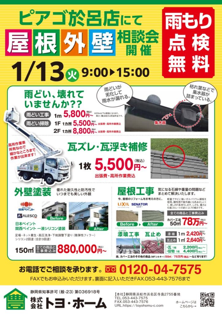 1月13日㈫ピアゴ於呂店さんにて屋根・外壁相談会を開催します。