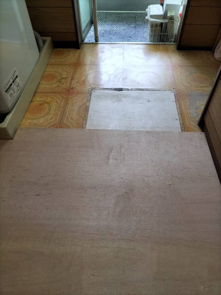 こんにちはトヨ・ホームの坪井です。 今日は、磐田市加茂H様邸の脱衣所床工事で 既存床点検口枠撤去、べニア貼り、クッションフロアー工事施工中です。 施工中施工中 磐田市屋根修理工事、磐田市雨樋修理工事、磐田市内装工事は、トヨ・ホームへ 社長ブロ... -