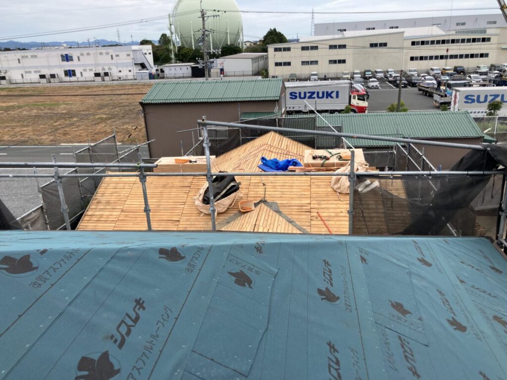 こんにちはトヨ・ホームの坪井です。浜松市中央区豊岡町Y様邸の屋根葺き替え工事きのうの夕方で瓦を下ろした部分はルーフィングシート張りまで完了しています。 社長ブログはこちら -