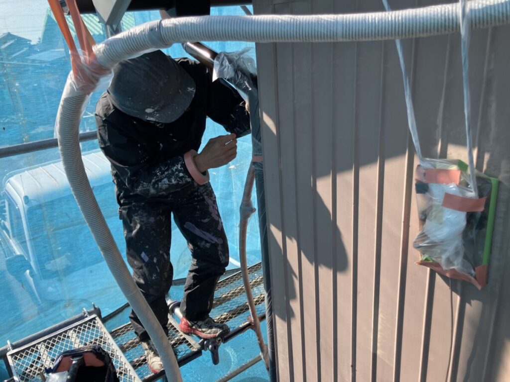 こんにちはトヨ・ホームの坪井です。今日も引き続き袋井市岡崎K様邸の外壁塗装工事でキリヨケ・戸箱枠・錆止め、中塗り施工後養生施工中です。 養生施工後、外壁トタン部分錆止めを施工していきます。 社長ブログはこちら -