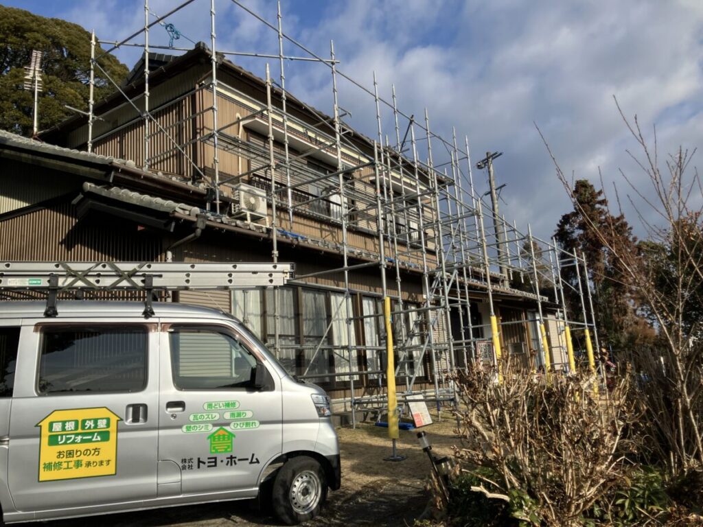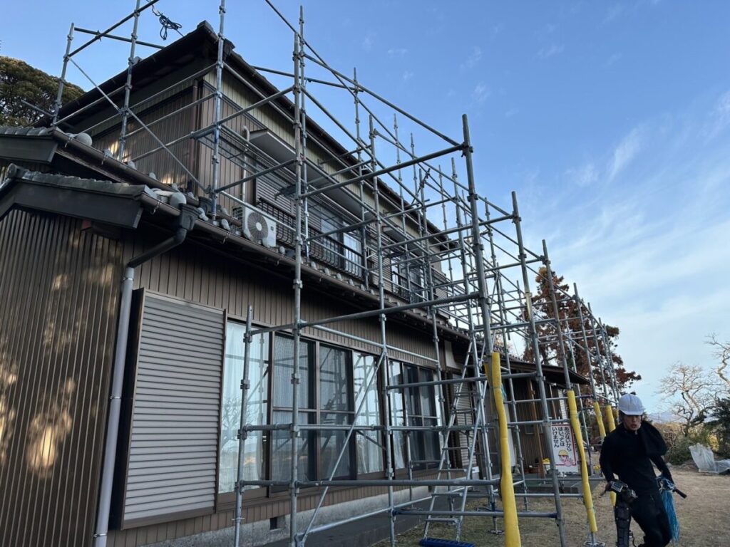 こんにちはトヨ・ホームの坪井です。今日から袋井市岡崎K様邸の外壁塗装工事前の架設足場施工中です。 来週から洗浄工事を施工していきます。 社長ブログはこちら -
