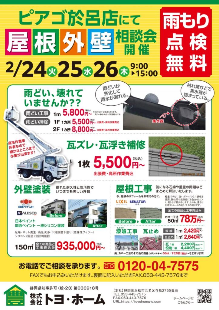 こんにちはトヨ・ホームの坪井です。今日から三日間浜松市浜名区尾野のピアゴ於呂店にて屋根・外壁・水廻り相談会開催中です。お時間ある方は、どんな小さな事でもお声かけ下さい。 社長ブログはこちら -
