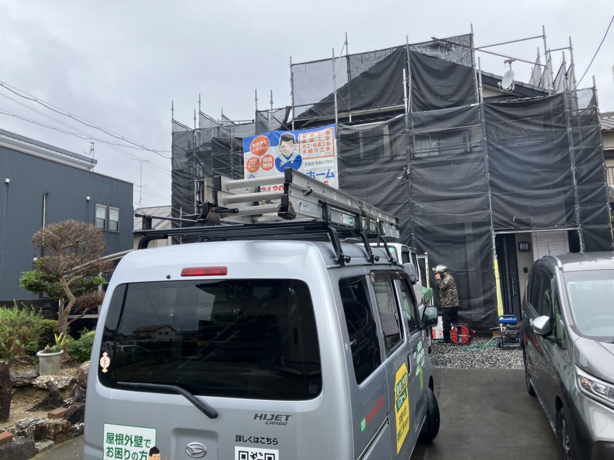 こんにちはトヨ・ホームの坪井です。今日から浜松市中央区三方原町S様邸の外壁塗装工事前の架設足場工事施工中です。 社長ブログはこちら -