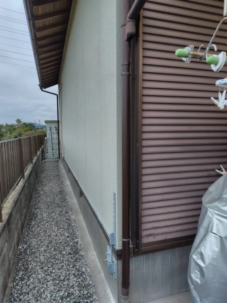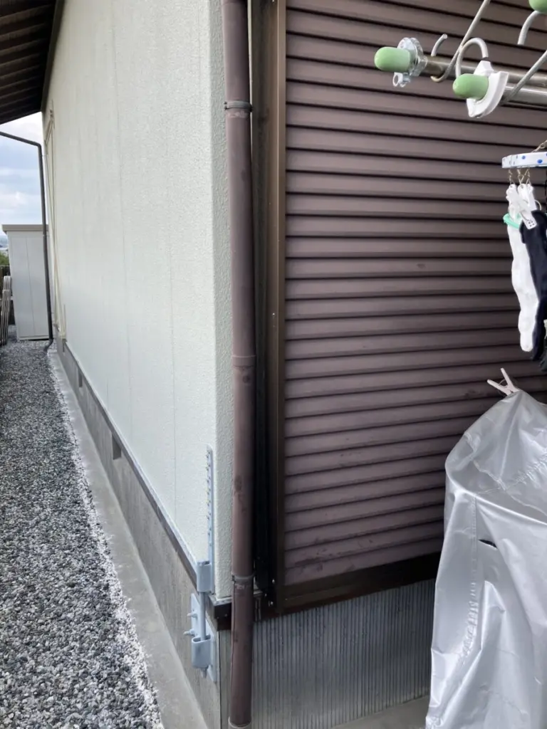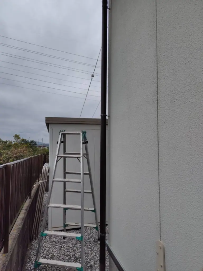 新しい竪樋を取り付けていきます。控金具を規定の間隔で外壁に打ち込んで取り付けます。その後、控金属に竪樋をはめ込み固定していきます。