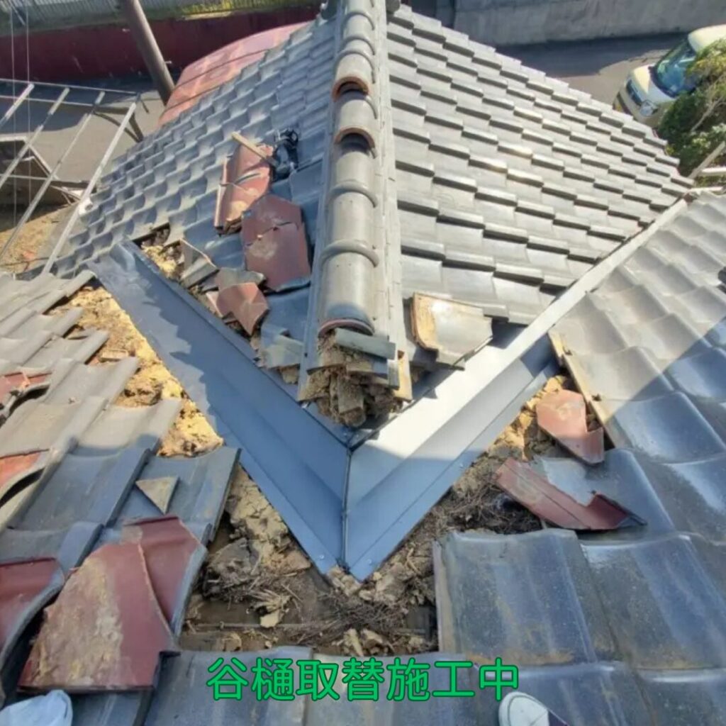 谷樋周辺の瓦や屋根材を丁寧に取り外します。古い谷樋と下地の防水シートを撤去します。