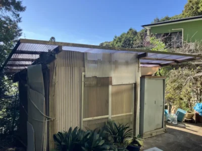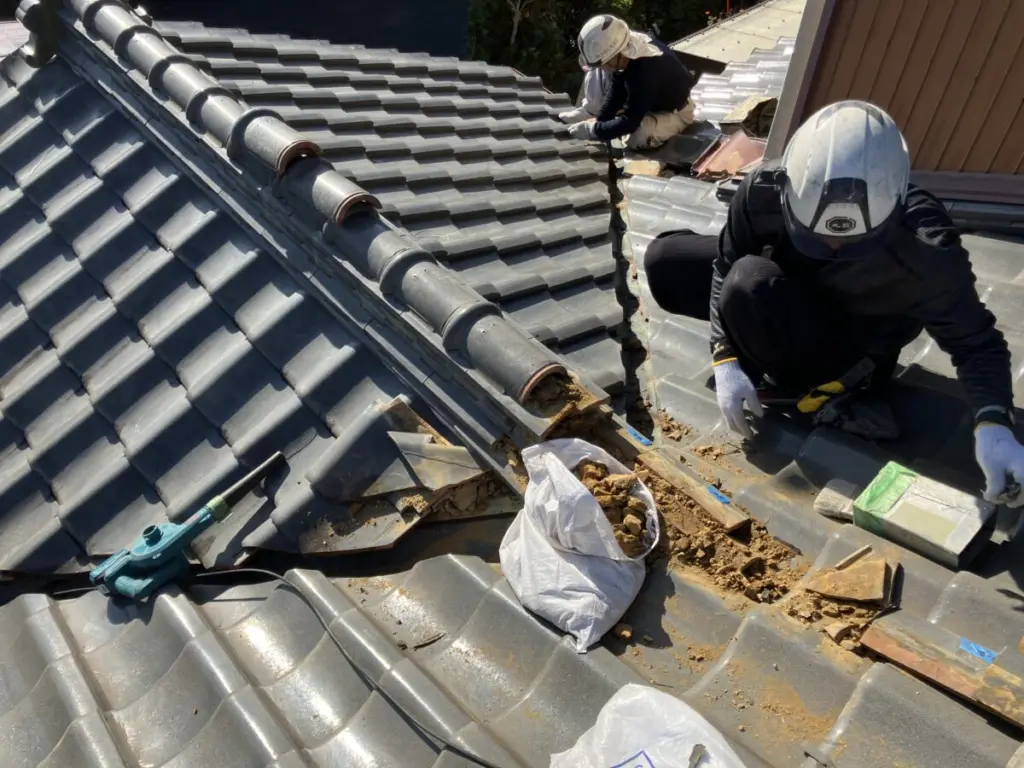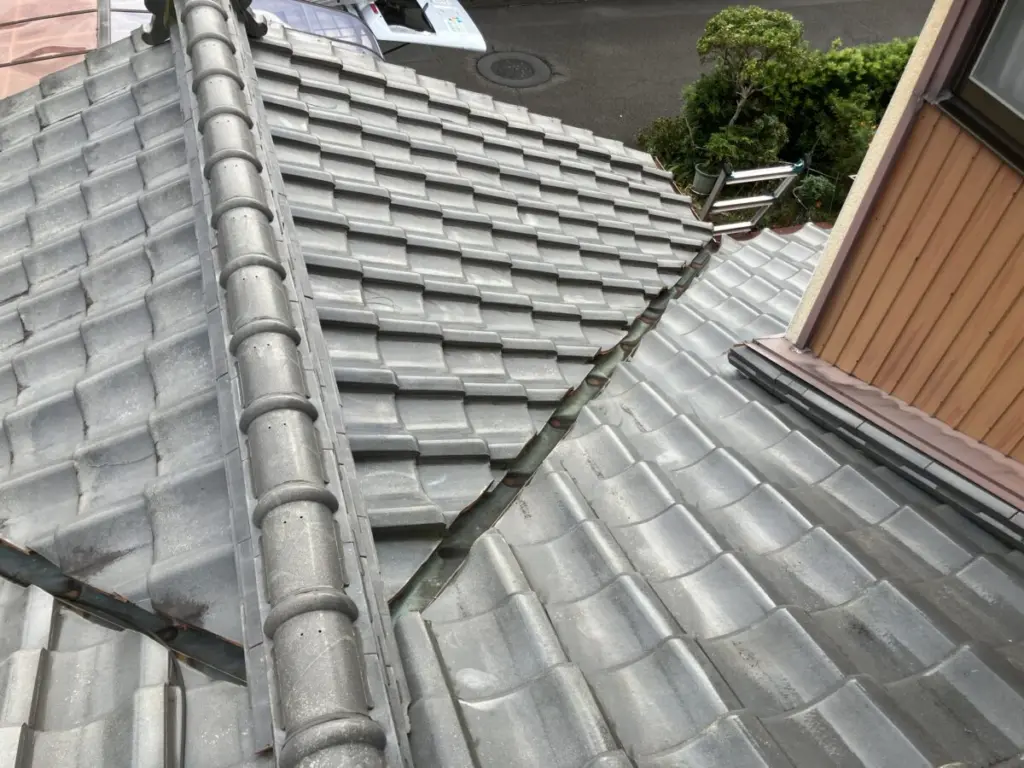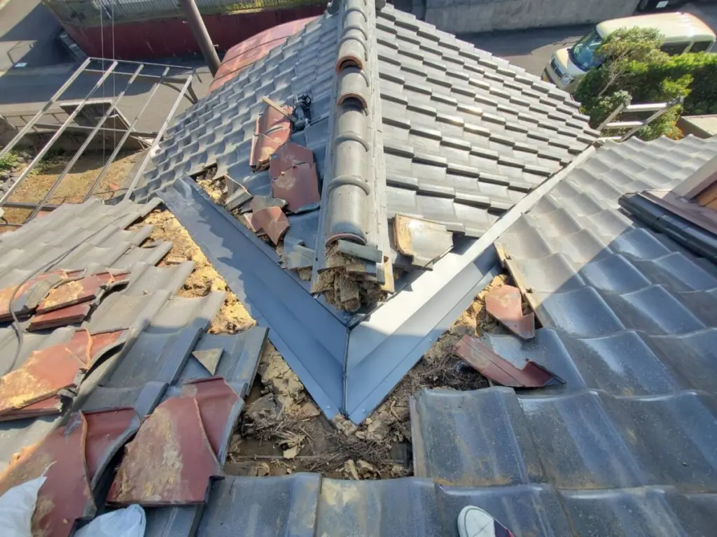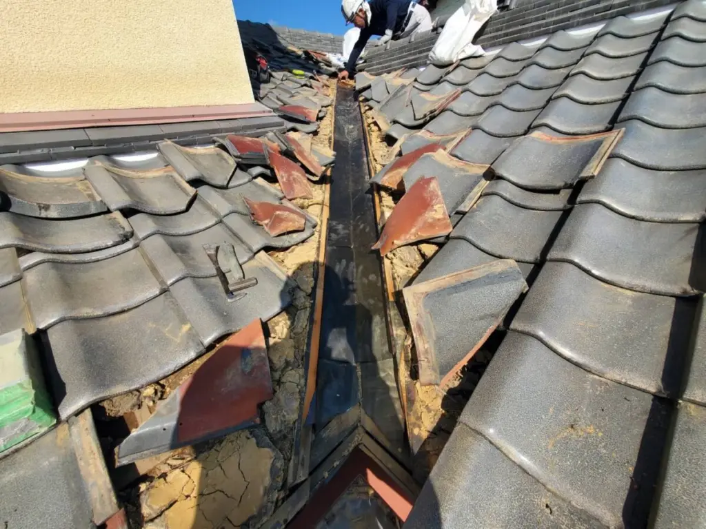 谷樋周辺の瓦や屋根材を丁寧に取り外します。古い谷樋と下地の防水シートを撤去します。