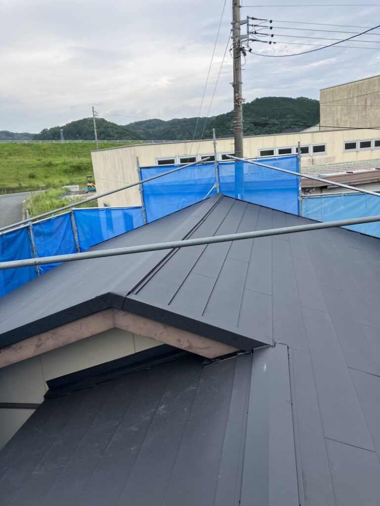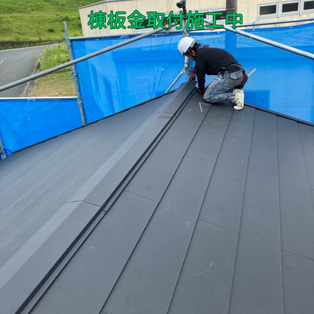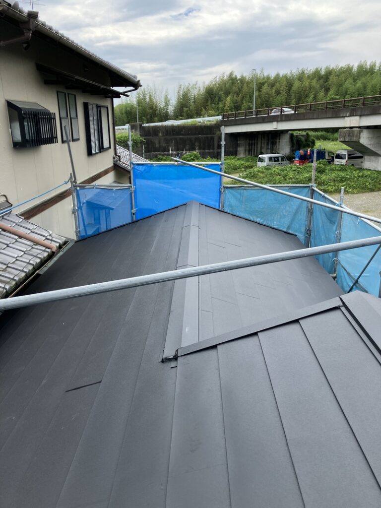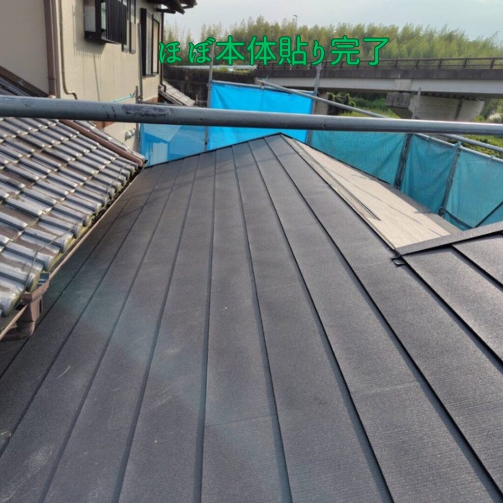 本体の福泉工業(株)シルキーG2を軒先から順番に貼っていきます。最後に棟板金を取り付けたら完成です。