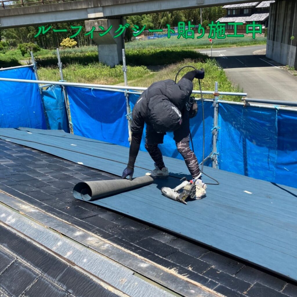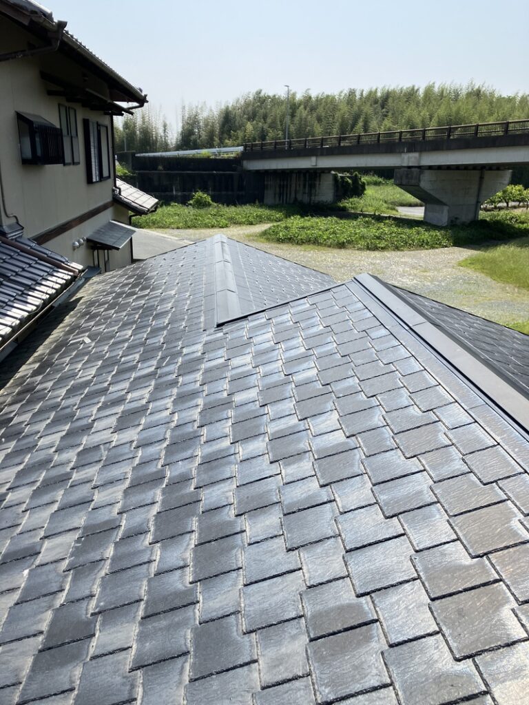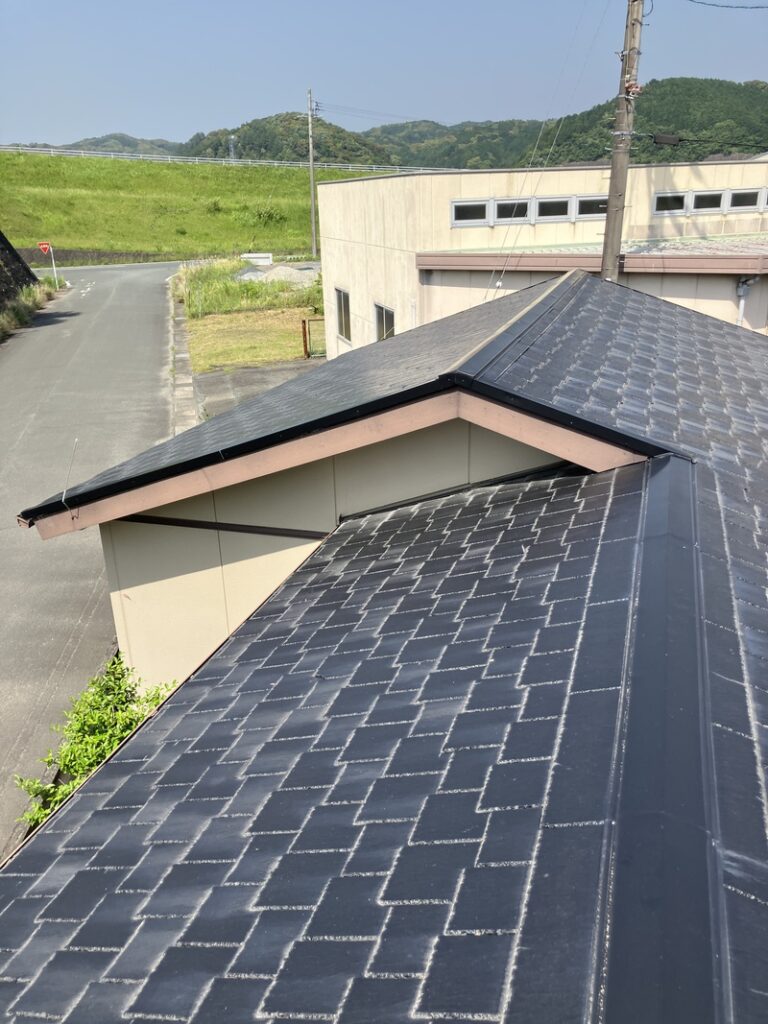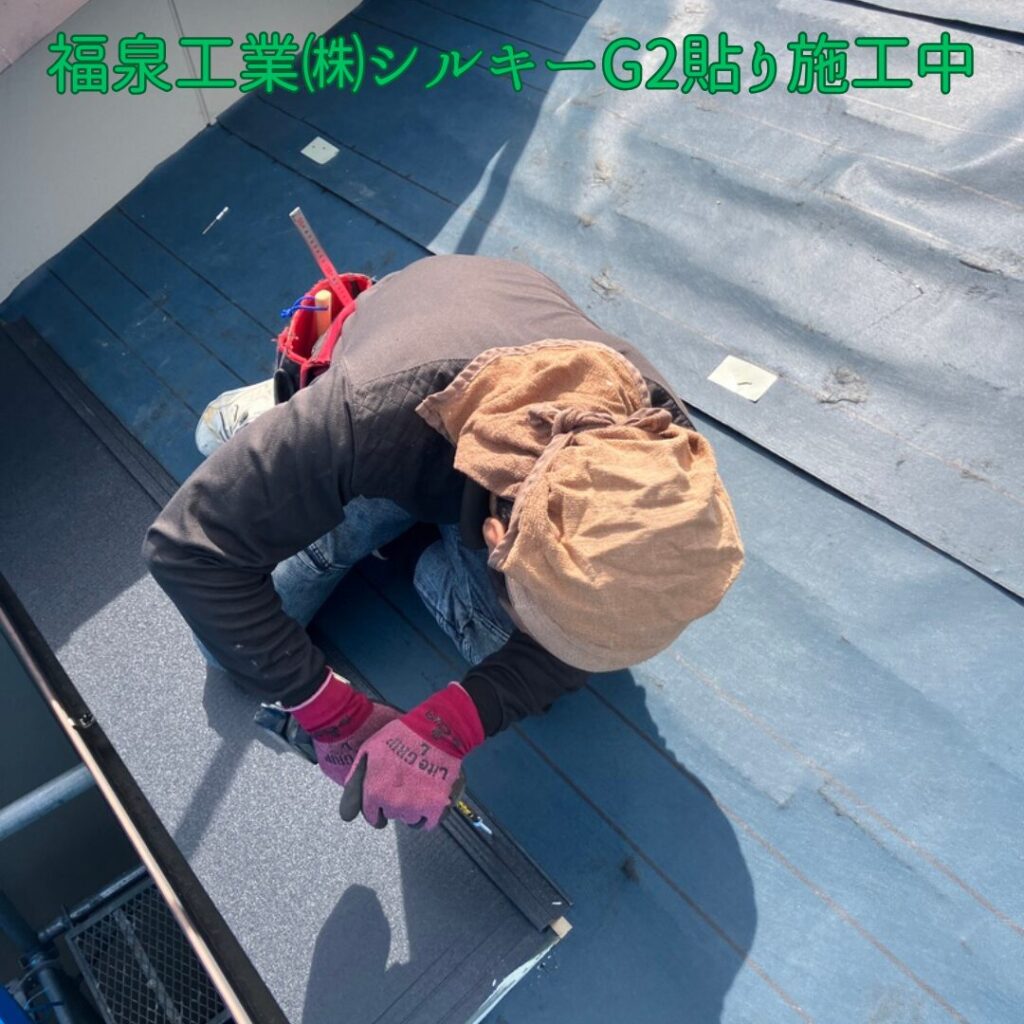本体の福泉工業(株)シルキーG2を軒先から順番に貼っていきます。最後に棟板金を取り付けたら完成です。