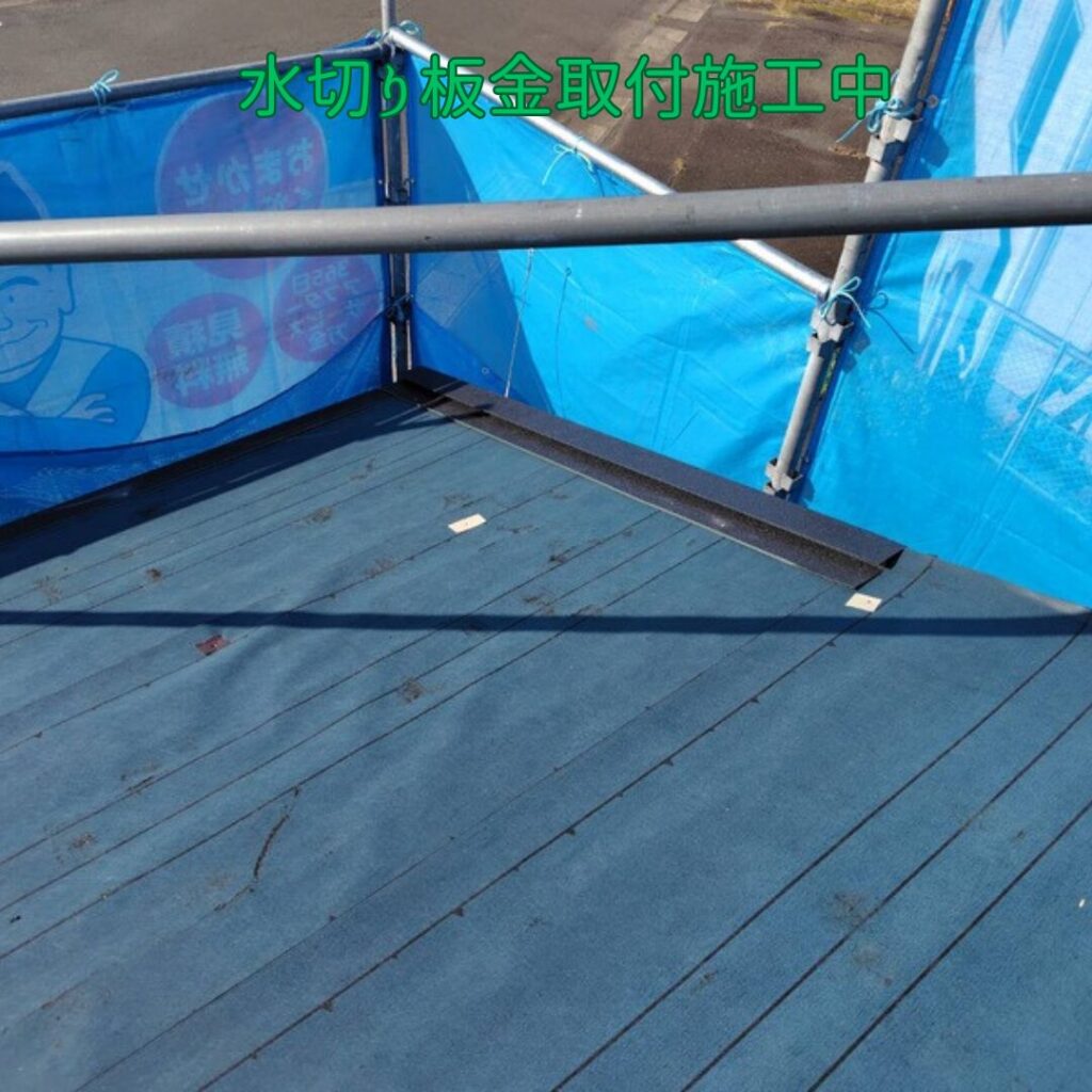 最初に既存の棟板金を撤去します。次に、軒先からルーフィングシート(防水シート)を貼っていきます。ルーフィングシートを貼った後に、役物板金の水切り板金を取り付けます。