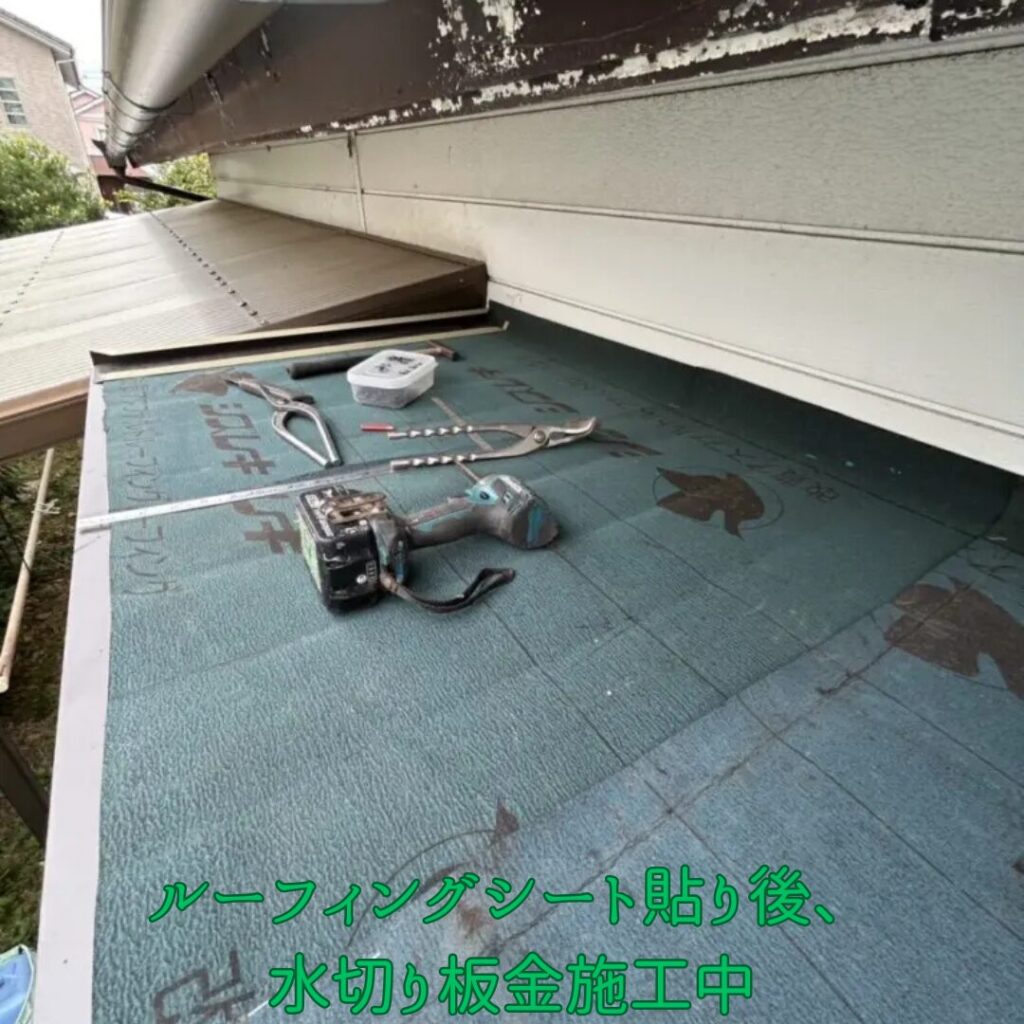 既存の玄関屋根に、コンパネを貼って軒先と破風に水切り板金を取付てルーフィングシート貼りました。